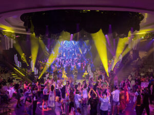 Nathaniel Cromwell and Michael Gionfriddo, working with EMF Lighting, were responsible for the design and programming of all shows and events in the Piazza, the ship’s heart. This venue, which runs all day and features anything from daytime washes to game shows and full production shows, needed dynamic and reliable fixtures. Michael remarked, “I think that the selection of fixtures from Robe in the Sun Princess Atrium was a perfect fit for the space. The PAINTE as a hard edge with an LED engine provides great color clarity and low maintenance considering the location of the fixtures. The Spiiders and Tetra1s live up to their reputation, providing vibrant looks and endless FX possibilities.” The Piazza also serves as one of the two nightlife spaces, featuring late-night discos in the center of the ship. Nathaniel added, “Robe lights consistently proved themselves to be the right job for the role. The Piazza is an important centerpiece to the Sun Princess. Having fixtures that are vibrant, quiet, and reliable is essential to the space, and Robe excelled in all categories.”